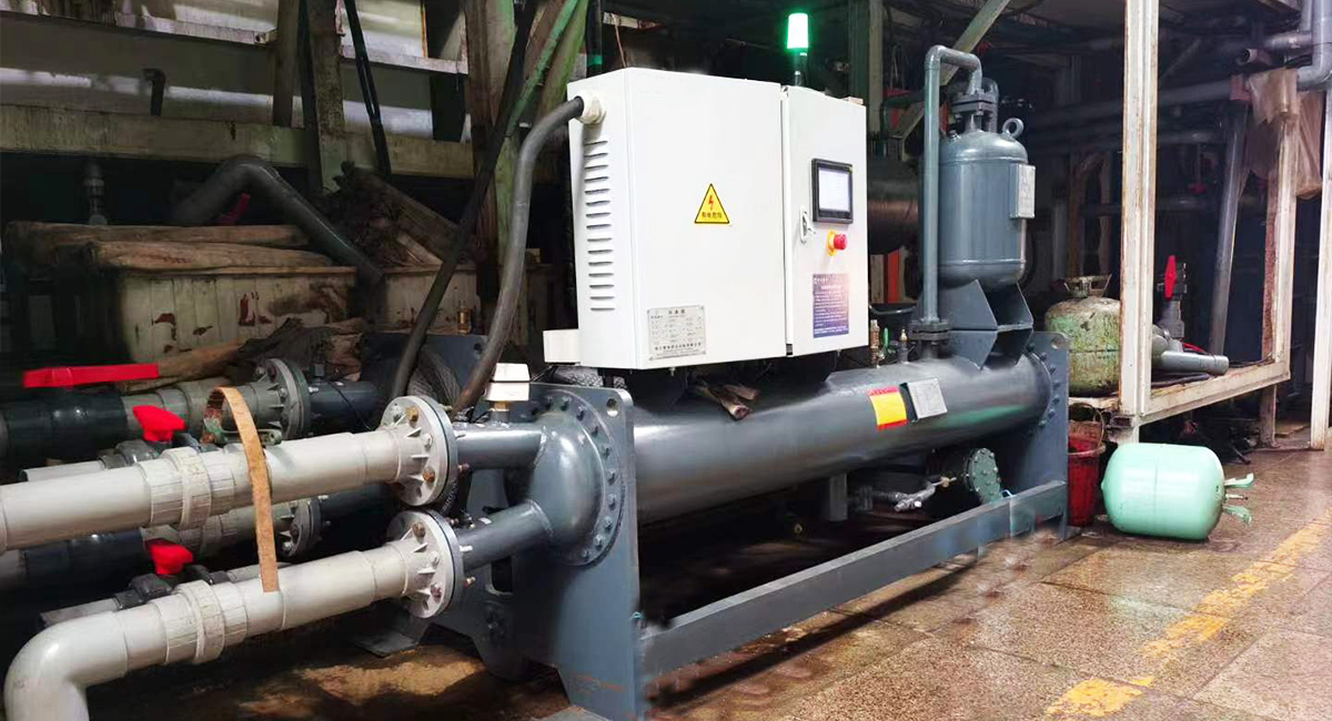 水冷冷水機利用殼管蒸發(fā)器使水與冷媒進行熱交換,冷媒系統(tǒng)在吸收水中的熱負荷,使水降溫產生冷水后,通過壓縮機的作用將熱量帶至殼管式冷凝器,由冷媒與水進行熱交換,使水吸收熱量后通過水管將熱量帶出外部散失。